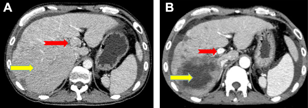 Figure 3: Image of a 48-year-old man with hepatocellular carcinoma and PVTT who showed a partial response after combined apatinib and TACE treatment. Contrast-enhanced CT at diagnosis showed a 134 mm diameter hepatocellular carcinoma nodule (yellow arrow) and multiple small metastatic lesions located in the liver, together with PVTT in the left and main portal vein (red arrow). CT images 1 month after diagnosis showed intrahepatic lesions in numerous non-enhanced areas (yellow arrow) and almost complete absence of PVTT without definite enhancement (red arrow).