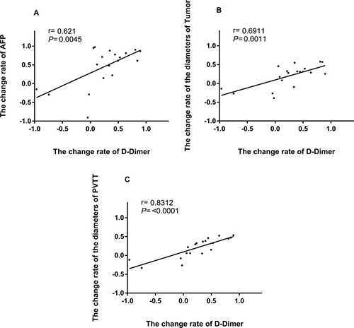 Figure 4: Association between the rate of change of D-dimer and rates of change of AFP, tumor diameter, and PVTT diameter. (A) Relationship between the rates of change of D-dimer and AFP after 1 month of apatinib combined with TACE treatment. (B) Relationship between the rates of change of D-dimer and tumor diameter after 1 month of apatinib combined with TACE treatment. (C) Relationship between the rates of change rate of D-dimer and PVTT after 1 month of apatinib combined with TACE treatment.
