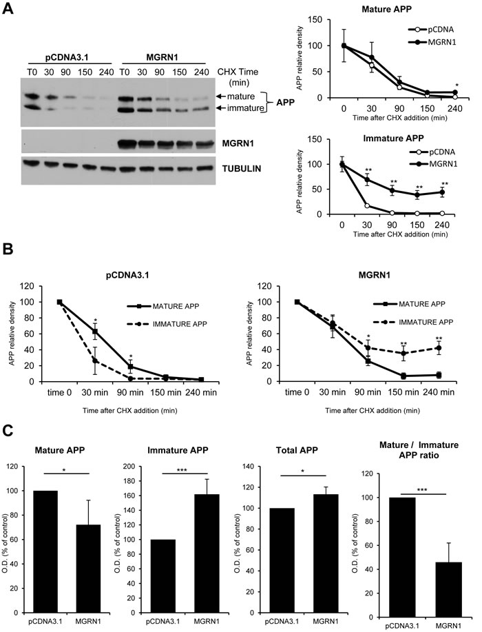 Figure 1: MGRN1 inhibits APP maturation in transfected HEK293 cells. A. Degradation rate of mature and immature levels of APP in absence or presence of MGRN1. Cells were transfected either with empty pCDNA3.1- or with MGRN1 plasmid, and then treated with CHX and collected at the indicated time points (in minutes). On the right, quantification of mature APP (upper graph) and immature APP (lower graph) from 4 independent experiments indicating how MGRN1 affects significantly the degradation rate of immature APP. Tubulin was used as loading control. Data are mean ± s.d. B. Quantification from 4 independent experiments of the degradation rate of mature APP versus immature APP in absence (left graph) of presence (right graph) of MGRN1. Data are mean ± s.d. C. Quantification of the steady-state levels of APP in absence (pCDNA3.1) or presence of MGRN1. MGRN1 decreased the levels of mature APP (first panel), increased the levels of immature APP (second panel) and total APP (third panel), and decreased the ratio of mature APP to immature APP (fourth panel) compared with control. Quantification from 5 independent experiments. Data are mean ± s.d.