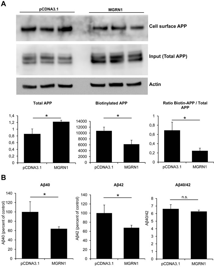 Figure 2: MGRN1 decreases cell-surface APP and Aβ secretion. A. Biotinylation experiments to examine cell-surface expression of APP in cells expressing MGRN1 or transfected with empty pCDNA3.1- vector. Triplicate experiments show how cells expressing MGRN1 show a decreased level of APP localized at the cell surface. On the bottom, quantification of total APP (left graph), biotinylated APP (central graph) and the ratio between biotinylated APP and total APP (right part). Quantification from 3 independent experiments. Data are mean ± s.d. B. ELISA experiments performed on the conditioned media of mock- and MGRN1-transfected HEK293 cells to detect Aβ. MGRN1 decreased the levels of both Aβ40 (left graph) and of Aβ42 (central graph), while the Aβ40/42 ratio is not affected (right graph). Quantification from 3 independent experiments. Data are mean ± s.d.