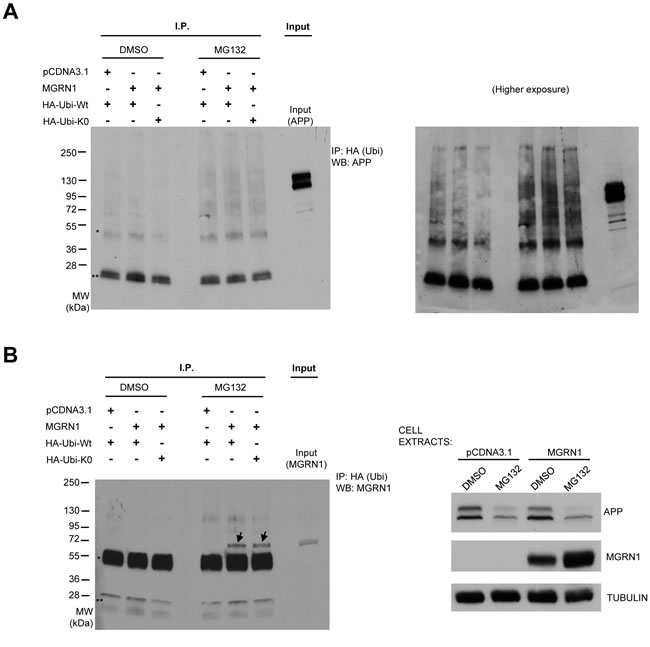 Figure 5: MGRN1 does not influence APP ubiquitination. A. HEK293 cells stably overexpressing human wild type APP695 were transfected with an empty plasmid or with MGRN1, and then with either HA-tagged wild-type ubiquitin (HA-Ubi-Wt) or with a lysine-less ubiquitin mutant (HA-Ubi-K0) able to promote only monoubiquitination. Cell extracts were then immunoprecipitated (“I.P.”) with anti-HA antibody, and then revealed against APP. One well on the right (“Input”) was loaded with cell extract in order to identify to molecular weight of APP. One asterisk (*) denote non-specific IgG heavy chains band, while two asterisks (**) denote non-specific IgG light chains band. Molecular weights are shown on the left. On the right, a higher exposure panel of the same western blot is shown. B. The membrane was re-incubated with anti-MGRN1 antibody. Two definite bands, denoted by arrows, appear on the wells relative to extracts of cells transfected with MGRN, ubiquitin and then treated with MG132. This result indicates that MGRN1 is monoubiquitinated, and confirms previous findings. The inputs of the cell extracts are shown on the right panel. Tubulin was used as loading control. Representative of n = 3 experiments.
