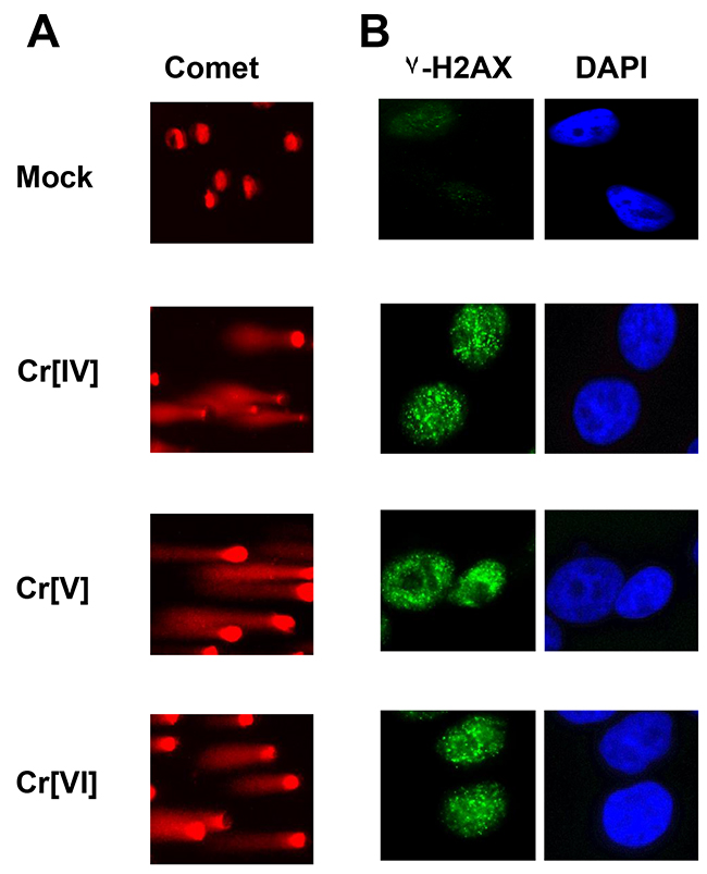 Figure 1: Cellular exposure to Cr[VI], Cr[V], or Cr[IV] results in DNA double-strand breaks. HeLa cells were exposed to 10 μM concentrations of Cr[VI], Cr[V], or Cr[IV]. After 30 minutes cells were (A) harvested and subjected to comet analysis or (B) fixed and stained for γ-H2AX foci formation. Comet tails and γ-H2AX foci are indicative of DNA double-strand breaks.