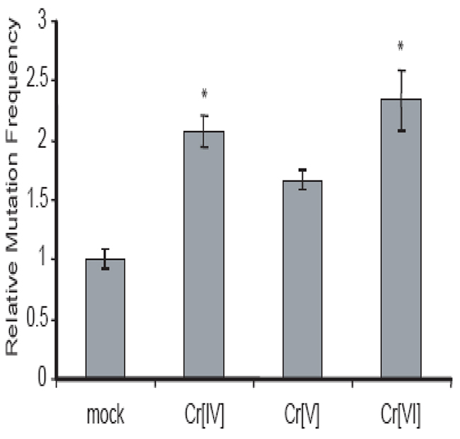 DNA damage resulting from exposure to Cr[VI] includes DNA intrastrand crosslinks, Cr-DNA adducts, and DNA single-strand breaks [4]. Exposure to Cr[VI] also results in the formation of DNA double-strand breaks, which are highly genotoxic lesions capable of inducing mutations [5]. Cr[VI] cannot directly interact with DNA, and studies indicate that it ceases to be genotoxic when experimental conditions do not favor reduction [6]. It is therefore likely that aspects of the reductive process contribute to Cr[VI]-induced genotoxicity and mutation. Specifically, metal-induced oxidative stress caused by high-valent chromate intermediates is thought to be the major mechanism responsible for Cr[VI]-induced DNA damage [7, 8]. To study cellular responses and the mutagenic potential of these intermediates, we utilized synthetic chromium intermediate compounds that have previously been discussed by Ramsey and Dalal and are determined to be suitable for mimicking endogenously produced Cr[IV] and Cr[V] intermediates [9].