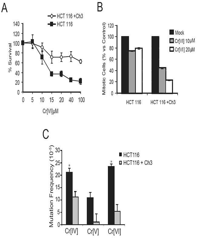 Figure 4: Functional mismatch repair is required for G2/M checkpoint activation and to limit mutation in response to Cr exposure. (A) HCT116 and HCT116+Ch3 cells were treated with 10 or 20μM doses of Cr[VI] for 4 hours and then assayed for a reduction in mitotic cells indicative of G2 checkpoint activation. (B) Comparison of Cr-induced mutation frequencies in MLH1-proficient and deficient cells exposed to 10μM doses of the Cr compounds for 24 hours (* indicates p-value<.05). (C) Addition of Ch3 to HCT116 cells results in reduced mutation frequency among treatments with all three chromium intermediates.