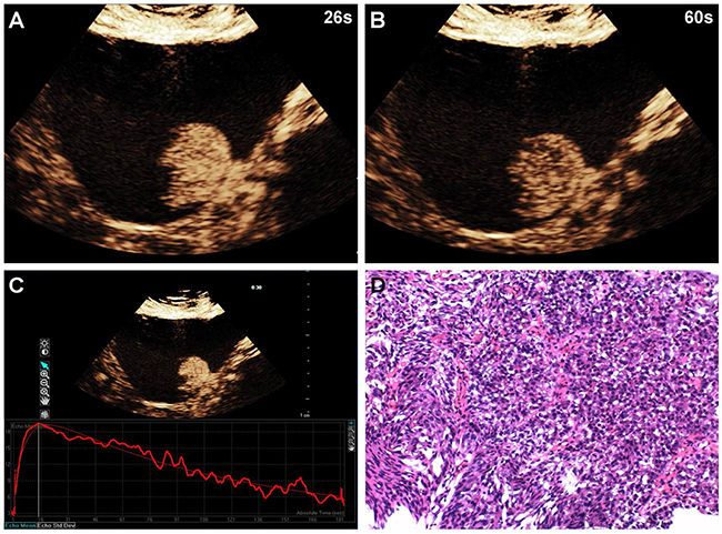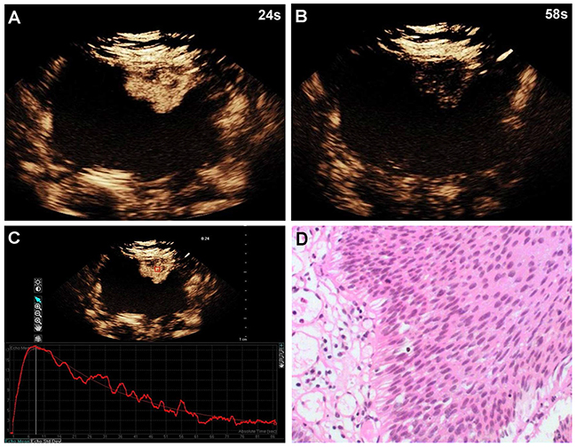 Figure 1: A 60-year-old woman with low-grade bladder cancer on the anterior bladder wall. CEUS shows strong and fast lesion enhancement during the late arterial phase (24 sec) (A), and complete wash-out during the venous phase (58 sec) (B). Time-intensity curve shows fast wash-in and fast wash-out, and lower PI (C). Surgical specimen confirming low-grade bladder cancer (hematoxylin & eosin staining, original magnification ×100) (D).