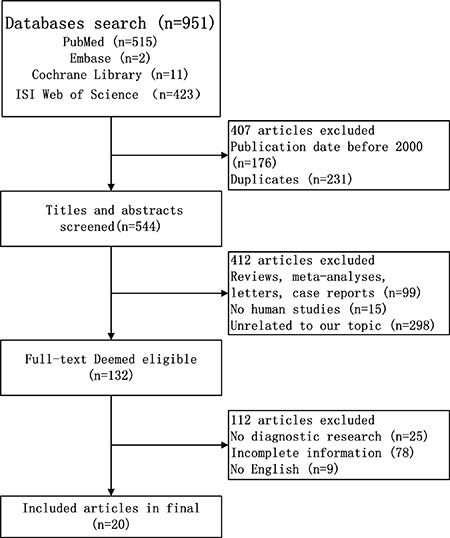 As shown in Figure 1, a search of four databases (PubMed, Embase, the Cochrane Library, and the ISI Web of Science) and a manual search identified 951 relevant articles. Of these, 176 were published before 2000, and 231 were duplicates. After sieving the titles and abstracts, 412 articles about reviews, case reports, letters, nonhuman studies, or unrelated to the topic were excluded. The rest of 132 studies were deemed to satisfactory, and they were read and evaluated carefully for a full-text review. Of these, 112 articles were eliminated for the following reasons: did not contain adequate data to construct a 2 × 2 table, did not contain sufficient information on the criteria used to diagnose HCC or analyzed only serum DCP and AFP alone, or they were published in non-English language periodicals. In total, 27 studies from 20 articles [11, 12, 14–16, 18–32] measured up for this meta-analysis and all of them were reported from 2000 to 2016.