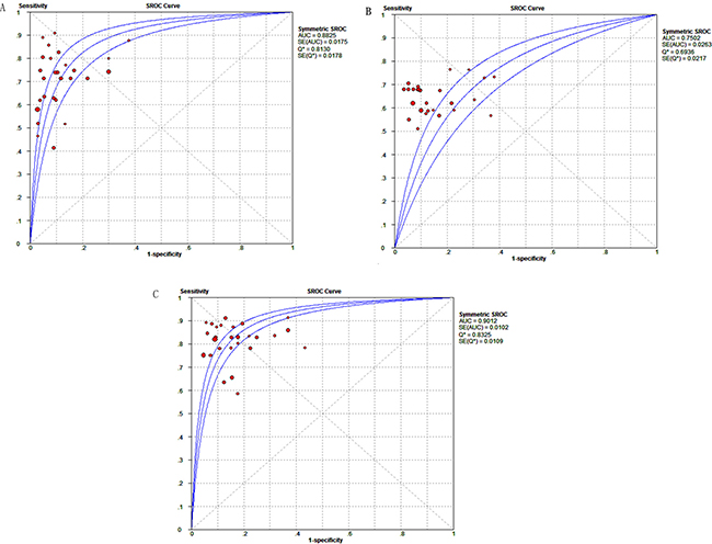 Figure 3: SROC curve of candidate makers for diagnosing HCC. (A) DCP; (B) AFP; (C) DCP + AFP.