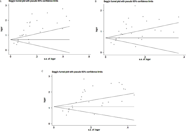 Figure 4: Begg’s funnel plot of candidate makers for the studies included in the meta-analysis. (A) DCP; (B) AFP; (C) DCP+AFP.