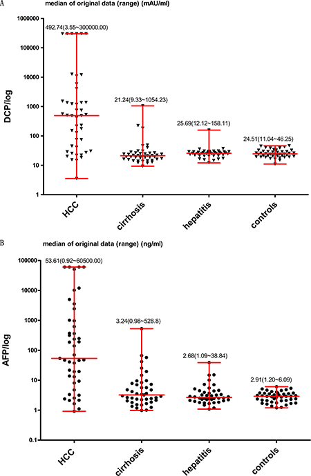 Figure 5: Levels of DCP and AFP in four different groups. DCP was measured in mAU/ml and AFP in ng/ml. Median of original data (minimum to maximum) was shown respectively in the figures.