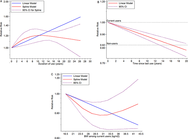 Figure 3: Dose-response meta-analyses on (A) duration of EPT use (year) and the risk of BC compared with non-users, (B) time (year) since last ET use and the risk of BC compared with current ET users, (C) BMI (kg/m2) and the risk of BC among current ET users.