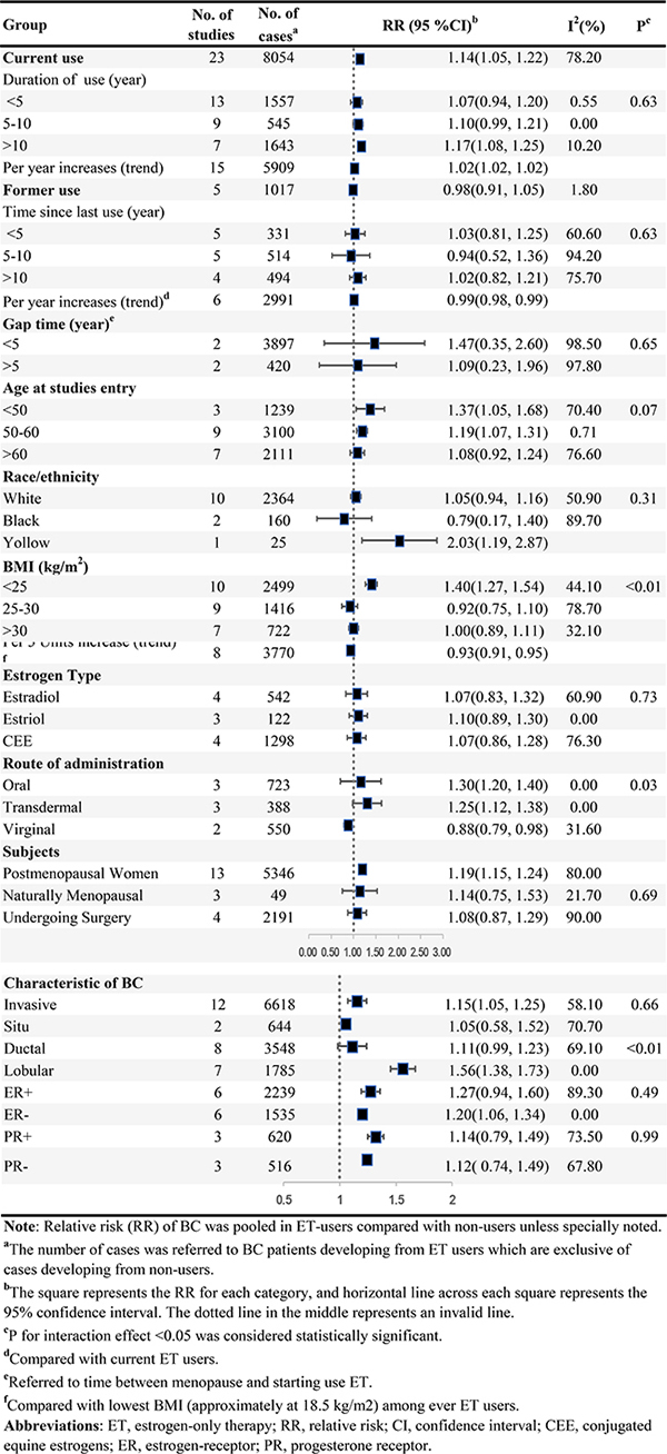 Subgroup analysis and meta-regression [53] with a Pinteraction were performed stratified by duration of current use, time since last HRT use, baseline characteristics of participants (i.e. age at study entry, race/ethnicity, BMI), types of hormone component, route of administration (i.e. oral, virginal, transdermal), mode of EPT combination (i.e. sequential, continuous), characteristics of BC (i.e. stage, histology, ER/PR status). Particularly, age and race/ethnicity were study-level factors which were identified by population characteristics, instead the rest of variables deriving from categorical outcomes in primary studies were employed to conduct precise subgroup analyses. In addition, we respectively presented dose-response analyses results on duration of HRT use and BC risk with 25 kg/m2 and 5years as the boundary values adopt by most studies to assess potential interaction effects from BMI and gap time.