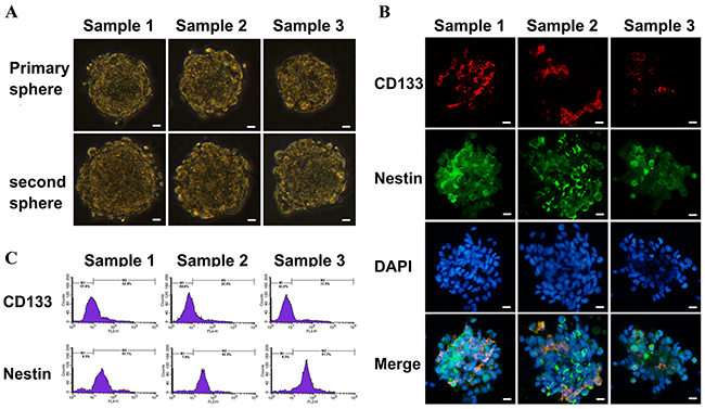 Figure 3: Identification of primary cultured GSCs from GBM samples. Scale bar =10 μm. (A) Sub-sphere formation was confirmed after primary spheres were dissociated into single cells (×400 magnification). (B) The expressions of GSCs markers were detected using immunofluorescence with antibodies against CD133 (red fluorescence) and nestin (green fluorescence) to assess biological characteristic of cultured cells (×400 magnification). (C) The percentages of CD133+ and nestin+ cells in GSCs were analyzed by flow cytometry.