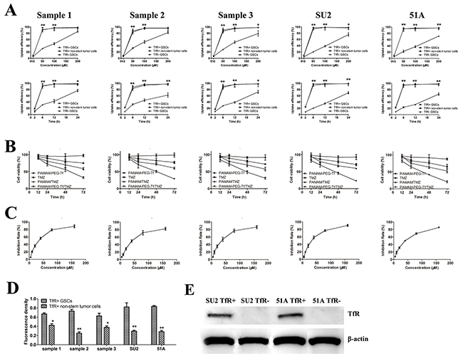 Fluorescence densities from PAMAM-PEG-Tf/TMZ in TfR+ GSCs as compared matched non-stem stem cells was markedly higher (P < 0.05 or P < 0.01; Figure 5D), and western blot analysis showed no expression of TfR on TfR- SU2 and 51A cells, which indicated successful TfR knockdown using siRNA (Figure 5E).