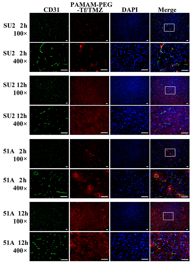 PAMAM-PEG-Tf/TMZ solution (5mg/kg) was injected into the tail vein of mice that were implanted with intracranial glioma in a volume of 100 μl. Next, animals were anesthetized and sacrificed. Mouse brains were removed, and frozen in OCT embedding medium to prepare sections at a thickness of 10 μm. Sections were immunostained with anti-CD31 antibody to analyze BBB permeability of PAMAM-PEG-Tf/TMZ after 2 h and 12 h post-injection. The slides were stained by immunofluorescence to detect SOX2 protein expression in xenografts to assess uptake by GSCs, and TUNEL staining was carried out for analysis of cell apoptosis after 24 h post-injection.