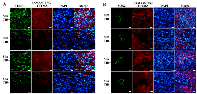The fluorescent images showed clearly that the PAMAM-PEG-Tf/TMZ and the stem cell marker SOX2, were co-localized in intracranial xenografts of TfR+ GSCs, and evident apoptosis was present in the cells that fully exhibited PAMAM-PEG-Tf/TMZ. No absorption of PAMAM-PEG-Tf/TMZ was seen in SOX2+ cells from TfR- GSC xenografts. Therefore, PAMAM-PEG-Tf/TMZ suppressed tumor growth more effectively than TMZ and PAMAM/TMZ due to drug accumulation by TfR+ GSCs.