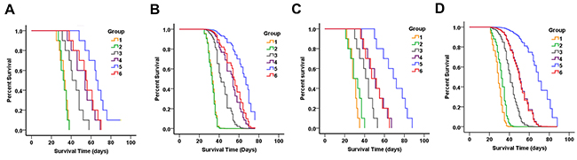 Figure 8: Therapeutic efficacy of PAMAM-PEG-Tf/TMZ in nude BALB/c mice bearing intracranial SU2 (A for Kaplan-Meier curves and B for Cox survival plots) and 51A (C for Kaplan-Meier curves and D for Cox survival plots) cellular xenografts. Animals were intravenously treated with normal saline (group 1); intravenously administered PAMAM-PEG-Tf (group 2); orally administered TMZ (group 3); intravenously administered PAMAM/TMZ (group 4); intravenously administered PAMAM-PEG-TfR/TMZ for TfR+ glioma xenografts (group 5); and intravenously administered PAMAM-PEG-TfR/TMZ for TfR- glioma xenografts (group 6). Drugs were administered continuously once per day for a total period of 5 days after intracranial tumor formation. A longer period of survival was shown in mice that exhibited TfR+ glioma xenografts when intravenously administered with PAMAM-PEG-TfR/TMZ as compared to controls, PAMAM-PEG-Tf, TMZ alone, PAMAM/TMZ and PAMAM-PEG-TfR/TMZ for TfR- glioma xenografts.