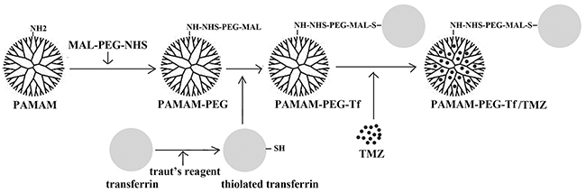 Figure 9: Preparation of Tf targeting nanoparticle. A Tf was thiolated by traut×s reagent to yield a thiolated Tf. PAMAM dendrimer was conjugated to MAL group of MAL-PEG-HNS (PAMA-PEG), then HNS group was conjugated with thiolated Tf to form PAMAM-PEG-Tf. TMZ was encapsuled in the cavities of PAMAM-PEG-Tf.