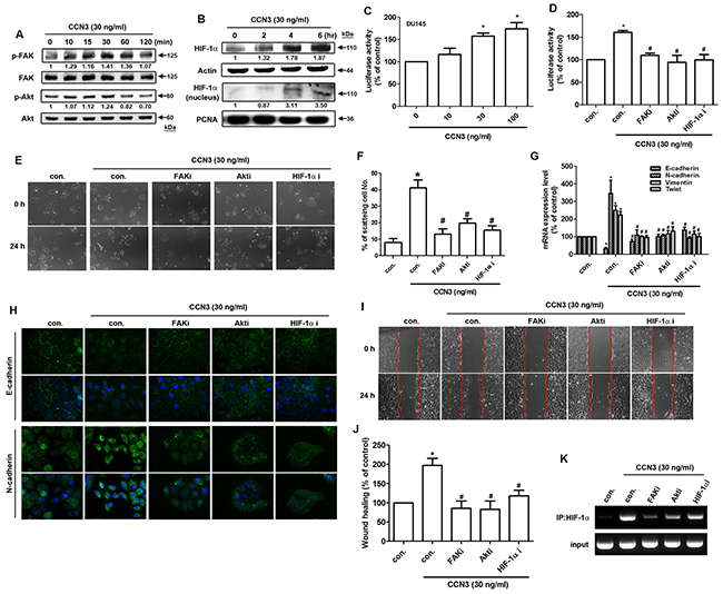 Figure 5: CCN3 triggers FAK/Akt/HIF-1α pathway to induce Twist expression and promotes EMT in PCa cells. (A) DU145 cells were incubated with CCN3 (30 ng/mL) for the indicated times, and phosphorylation of FAK and Akt was determined by western blot analysis. (B) DU145 cells were incubated with CCN3 (30 ng/mL) for the indicated times. The total protein and nuclear extract were prepared, and HIF-1α expression levels were determined by western blot analysis. Actin and PCNA were used as internal control. (C) DU145 cells were transfected with an HRE promoter reporter plasmid for 24 h, then incubated with CCN3 for 24 h at indicated doses and luciferase activity was measured. (D) DU145 cells were transfected with an HRE promoter reporter plasmid for 24 h, followed by treatment with FAKi (10 μM), Akti (1 μM) or HIF1-α i (1 μM) for 30 min. The cells were then incubated with CCN3 (30 ng/mL) for 24 h, and luciferase activity was measured. (E) DU145 cells were treated with FAKi (10 μM), Akti (1 μM) or HIF1-α i (1 μM) for 30 min and then incubated with CCN3 (30 ng/mL) for 24 h. The cells were photographed to analyze scattering and morphology. (F) The quantitative analysis of scatter assay which was performed in Figure 3A. (G) DU145 cells were treated as described (Figure 4E), total RNA was extracted, and expression levels of E-cadherin, N-cadherin, vimentin, and Twist were examined by qPCR. (H) DU145 cells were treated as (Figure 4E) described, the cells were stained with E-cadherin and N-cadherin antibodies and analyzed by fluorescence microscopy. Nuclei were counterstained with DAPI. Representative microscopy images are shown. (I and J) DU145 cells were treated as (Figure 4E) described, and in vitro migration was measured by wound healing assay. The migrating cells were photographed and counted. (K) DU145 cells were pretreated with FAKi (10 μM), Akti (1 μM) or HIF1-α i (1 μM) for 30 min and then incubated with CCN3 (30 ng/mL) for 24 h. Chromatin immunoprecipitation was performed with HIF1-α antibody. One percent of immunoprecipitated chromatin was assayed to verify equal loading (input). Results are expressed as the mean ± S.E.M. *p < 0.05 compared with control, #p < 0.05 compared with CCN3-treated group.