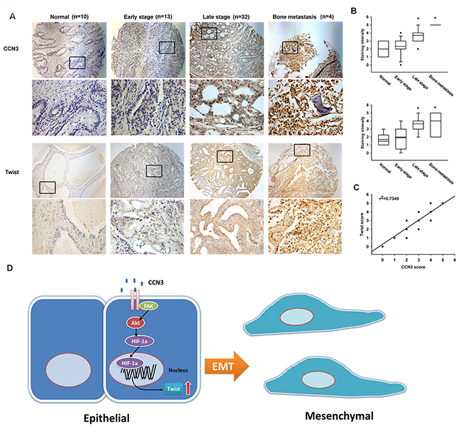 Figure 6: Prostate cancer specimens show significant correlations between CCN3, Twist expression and tumor progression. (A) Tumor specimens were stained with CCN3 and Twist antibodies by IHC staining. The stained specimens were photographed by optical microscope. (B) The IHC stain intensities of CCN3 and Twist were scored from 1-5 to quantify the expression levels of CCN3 and Twist in different stages. (C) IHC stain scores of CCN3 and Twist were paired from the same specimens and the correlation between CCN3 and Twist expression levels was shown by linear regression in prostate cancer specimens. (D) Diagrammatic model for the molecular mechanism of CCN3-promoting EMT in prostate cancer.
