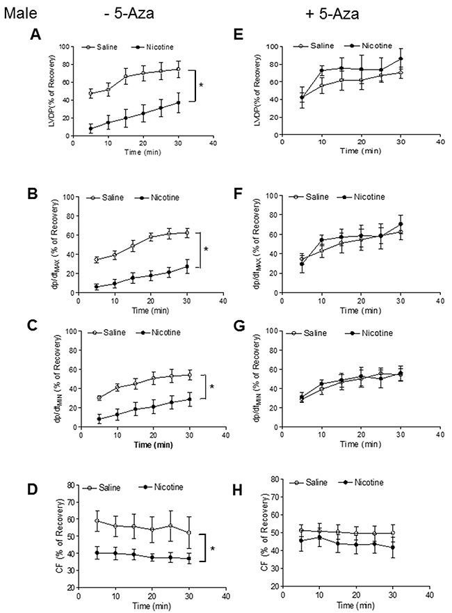 Figure 2: 5-Aza reversed perinatal nicotine-induced decrease in post-ischemic recovery of LV function in female offspring. Pregnant rats were treated with saline (control) or nicotine, and pups were administered with 5-Aza (i.p. 1mg/kg/day) on postnatal day 3, 7 and 10 after delivered. At one month of age, LVDP (A, E), dp/dtmax (B, F), dp/dtmin (C, G), CF (D, H) of isolated hearts were determined after subjected to 30 min of ischemia and 30 min of reperfusion in Langendorff apparatus. Data are means ± SEM (n = 5-6 animals/group from different litter). * P < 0.05 vs control.