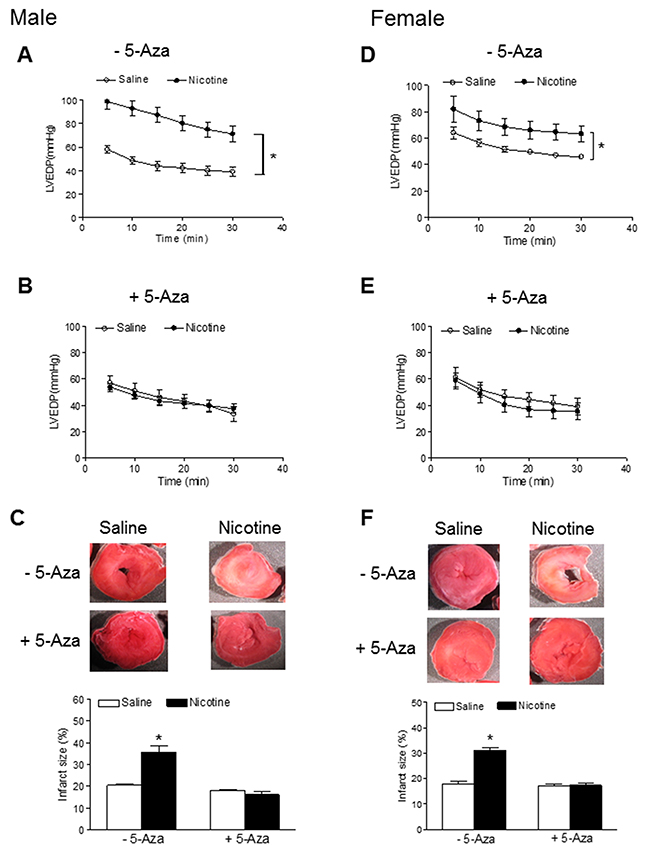 Figure 3: 5-Aza prevented perinatal nicotine-induced increase in myocardial infarction in offspring. Pregnant rats were treated with saline (control) or nicotine, and pups were administered with 5-Aza (i.p. 1mg/kg/day) on postnatal day 3, 7 and 10 after delivered. At one month of age, LVEDP of isolated hearts in the absence (A, D) or presence (B, E) of 5-Aza were determined after subjected to 30 min of ischemia and 30 min of reperfusion in Langendorff apparatus, and infarct size (C, F) of isolated hearts was determined by TTC staining. Data are means ± SEM (n = 5-6 animals/group from different litter). * P < 0.05 vs control.