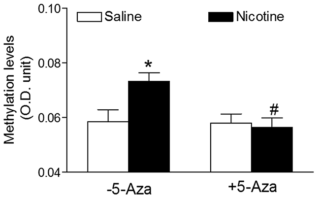 Figure 4: 5-Aza abrogated perinatal nicotine-induced heightened global DNA methylation levels in the LV tissues of male offspring. Pregnant rats were treated with saline (control) or nicotine, and pups were administered with 5-Aza (i.p. 1mg/kg/day) on postnatal day 3, 7 and 10 after delivered. At one month of age, the global DNA methylation was qualified by 5-mC ELISA in the left ventricle tissues isolated from male offspring. Data are means ± SEM (n = 4-6 animals/group from different litter). * P < 0.05 vs control. # P < 0.05 vs -5-Aza.