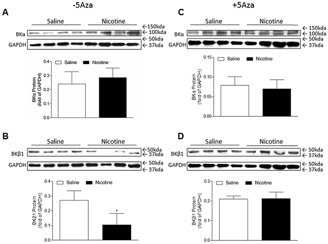 5-Aza treatment restored the perinatal nicotine-induced decrease in the expression of BKca channel β1 subunit in the LV tissues
