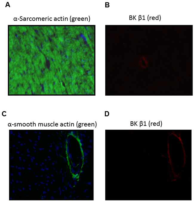 Figure 8: Localization of BKca channel β1 subunit in the LV tissues of male offspring. Immunofluorescence staining of heart section with α-sarcomeric actin (A, green), α-smooth muscle actin (C, green), BKca channel β1 subunit (B and D, red). Nuclei were stained with DAPI (A and C, blue). BKca channel β1 subunit was detected in the coronary vascular walls (B, D).