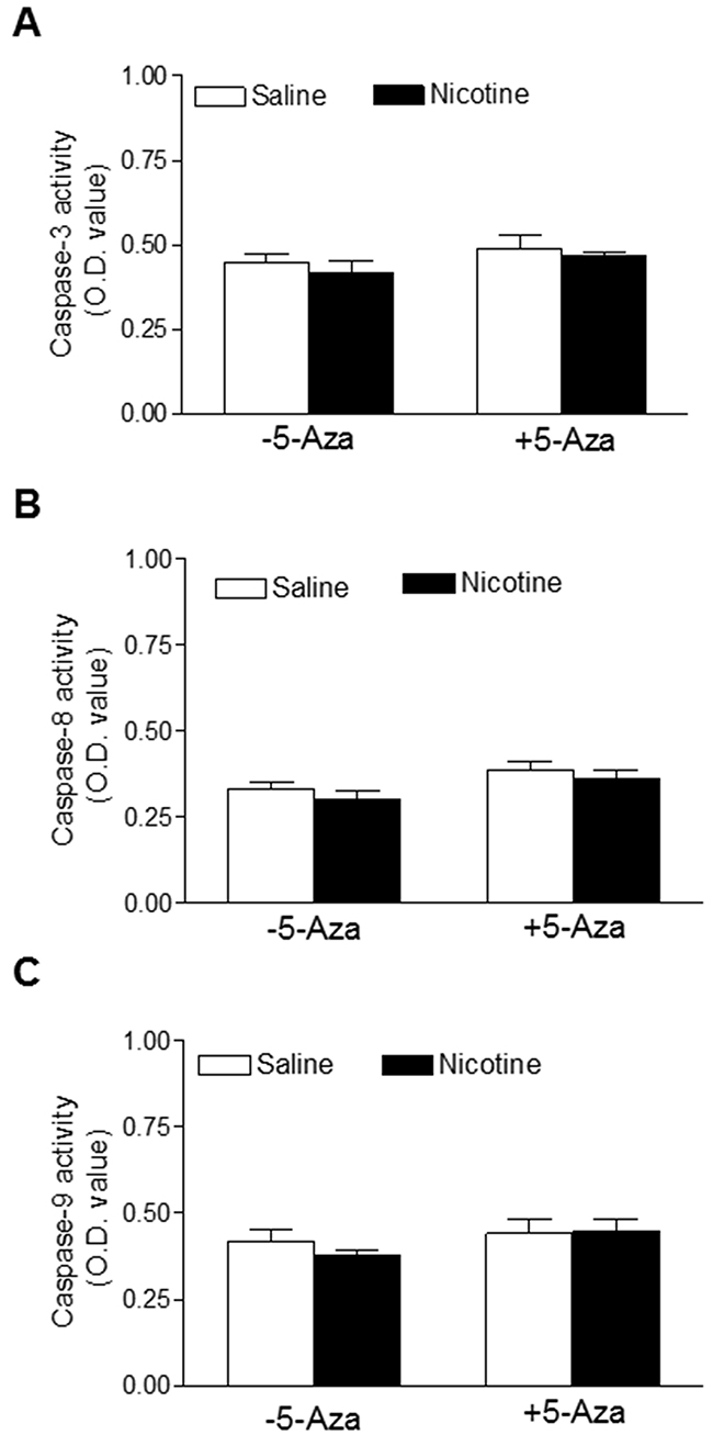Apoptosis is implicated in diverse pathological processes. The activation of caspase is a unique feature of apoptosis. Therefore, we examined the protease activities of caspase-3, caspase-8, and caspase-9 in the LV tissues. As shown in Figure 9, the activities of caspase-3, -8, or -9 activities in the LV tissues did not have significant differences between the nicotine-treated and saline control groups. In addition, the 5-Aza treatment had no effects on the caspase activities.