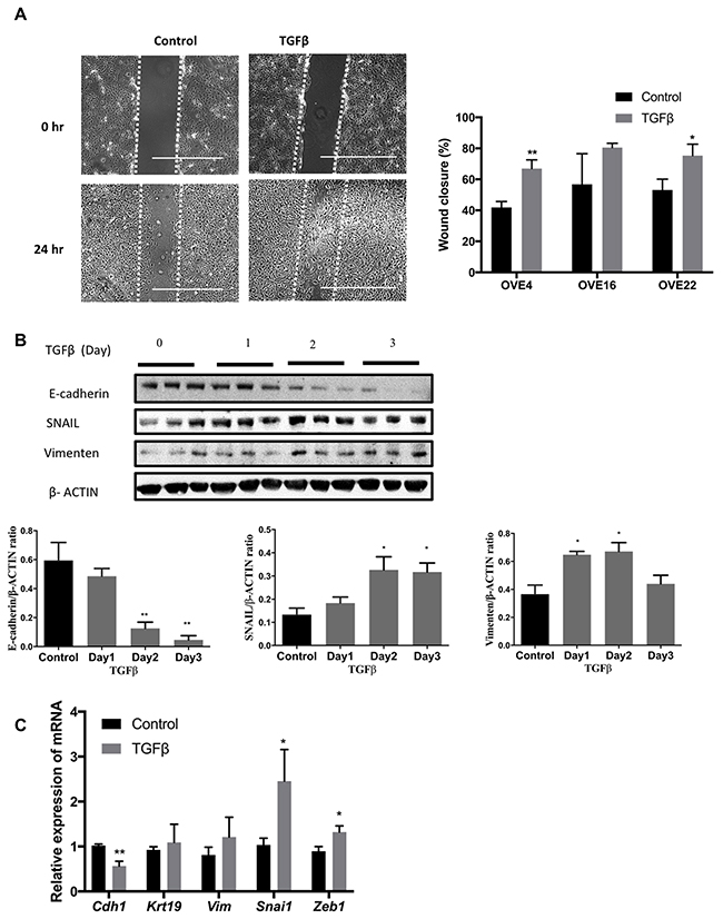 Figure 2: TGFβ induces EMT in oviductal epithelial cells. (A) TGFβ pre-treatment for 3 days increased cell migration of OVE4 and OVE22 cells, as seen 24 hours after wounding. (B) Western blot and densitometric analysis for epithelial and EMT proteins (E-cadherin, SNAIL and Vimentin) in OVE4 cells treated with TGFβ for up to 3 days. (C) qPCR analysis for mRNA encoding for epithelial and EMT genes for OVE4 cells treated for one day with TGFβ. Data are from three independent experiments and are presented in histograms as mean ± SEM. Scale bars indicate 400μm. * indicates p<0.05; ** indicates p<0.01.