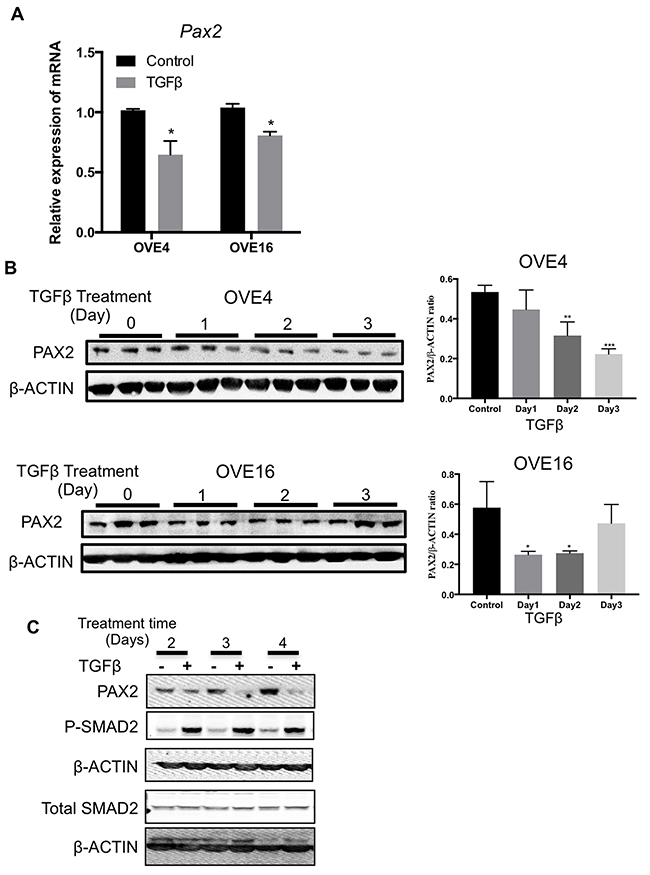 Figure 5:TGFβ suppresses Pax2 expression in oviductal epithelial cells. (A) qPCR analysis for mRNA encoding Pax2 for OVE4 and OVE16 cells treated for one day with TGFβ. (B) Western blots and histogram of densitometric analysis show decreased abundance of PAX2 after 1-2 days of 10ng/ml TGFβ treatment of OVE4 and OVE16 cells. (C) Western blot shows time course of TGFβ treatment resulting in coincident reduction of PAX2 abundance with increased SMAD2 phosphorylation. All data are representative of three independent experiments except SMAD2 western blot that is representative of two independent experiments. Data presented in histograms are mean ± SEM. * p<0.05; ** p<0.01; *** p<0.001.