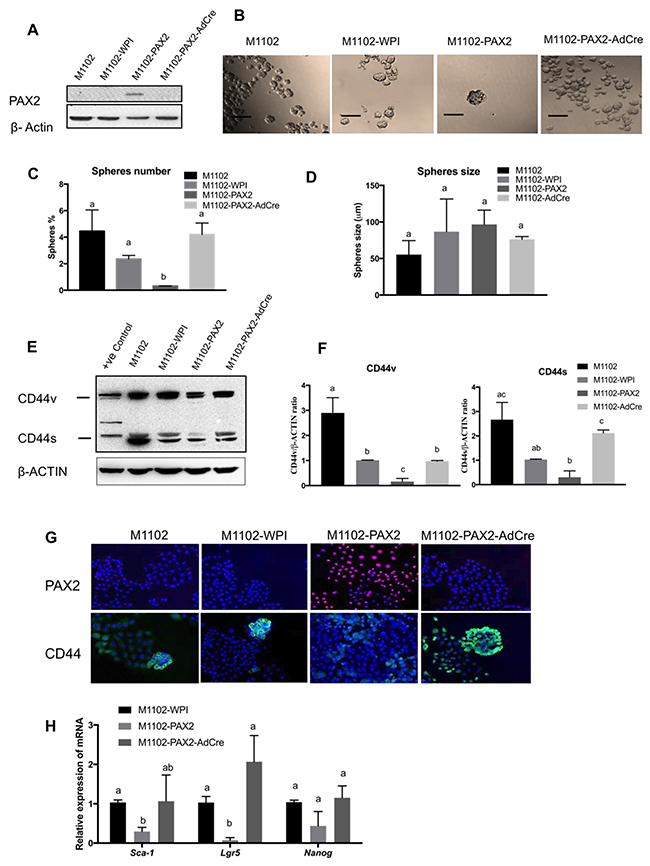 To better understand the role of PAX2 in inhibiting stemness, we forced Pax2 expression in OSE cells (M1102) which do not normally express Pax2. We have previously shown that M1102 cells have a subpopulation with stem cell characteristics that include SCA-1 expression and sphere formation [31]. M1102 cells were transduced with a loxP-flanked construct expressing Pax2 as shown by western blot (Figure 7A). In M1102 cells expressing PAX2, sphere formation was significantly reduced, compared to parental cells and the vector control. When the Pax2 gene was deleted by treatment of the cells with adenovirus expressing Cre recombinase, the capacity for sphere formation was restored (Figure 7B and 7C). Sphere size was not affected by any of the treatments (Figure 7D). Levels of CD44 protein were reduced by Pax2 expression in M1102 cells, as shown by western blot (Figure 7E and 7F) and immunofluorescence (Figure 7G). In addition, expression of Pax2 decreased the expression of other stem cell markers such as Sca-1 and Lgr5 in M1102 cells (Figure 7H).