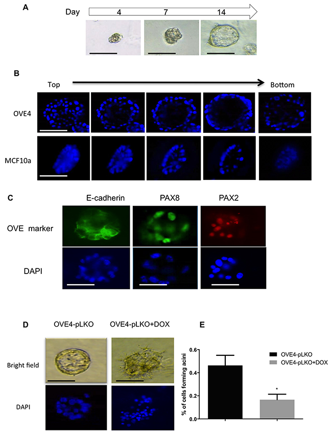 Figure 8: PAX2 is required for epithelial differentiation of OVE cells. (A) Formation of luminal structure by OVE cells cultured in matrigel starts with small spheres by day 4 and ends with spheroids with a lumen by day 14. (B) Immunofluorescence by Z-stack imaging starting from the top of spheroids formed by OVE4 and MCF10a cells in matrigel after 14 days of culture shows the lumen in the middle of each spheroid. (C) OVE4-derived luminal structures express E-cadherin and the oviductal markers, PAX2 and PAX8, as detected by immunofluorescence. (D) Knockdown of PAX2 (right panels) disrupts the formation of luminal structures by OVE4 cells (left panels), which is quantified in (E). Data are presented as mean ± SEM (N=3). Scale bars in (A-C) indicate 100μm. * indicates p<0.05.