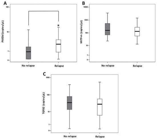 We have analyzed the changes in PAX3d, MITF-m and TGFB2 copy numbers on a larger CMM patients’ cohort (with or without melanoma relapse) during their clinical monitoring.