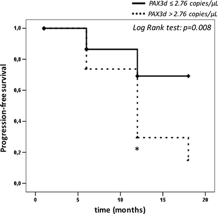 Finally, we also showed as PAX3d values higher than 2.76 copies/μL can stratify patients at high risk of CMM recurrence independently of age, gender and AJCC staging. The survival analysis confirmed the robustness in relapse prediction of such biomarker depending on PAX3d cut-off. In this context, values more than 2.76 copies/μL may help clinicians to start intensive clinical monitoring in CMM patients at high risk of disease.
