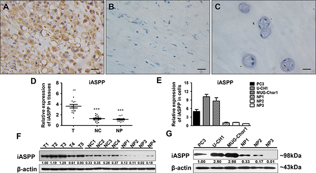 Figure 1: iASPP expression in chordoma tissues and cells. (A–C) Immunohistochemistry staining of iASPP in chordoma tissues (A), distant normal control tissues (B), and nucleus pulposus (C). T: tumor group, NC: normal control tissues group, NP: nucleus pulposus tissues group. (D) Relative expression of iASPP in tissues as detected by RT-qPCR. ***p < 0.001 vs. tumor group. (E) Relative expression of iASPP in cells as detected by RT-qPCR. (F) Relative expression of iASPP in tissues as detected by WB. (G) Relative expression of iASPP in cells as detected by WB. Numbers below pictures of F and G represent semi-quantitative analysis of each line by Quantity One software. Bar scale = 20 μm.