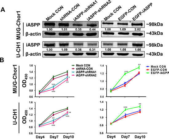 Figure 3: The extrinsic knockdown and overexpression of iASPP and their effects on cells proliferation based on CCK-8 assays. (A) The extrinsic knockdown and overexpression of iASPP in MUG-Chor1 and U-CH1 cells as identified by WB. Numbers below pictures represent semi-quantitative analysis of each line by Quantity One software. (B) Proliferation of both cells with iASPP knockdown and overexpression. n = 3. Mean ± SEM. *p < 0.05, **p < 0.01, ***p < 0.001, iASPP-shRNA1 group or iASPP-shRNA2 group vs. shRNA-CON group, and EGFP-iASPP group vs. EGFP-CON group. CON: control.
