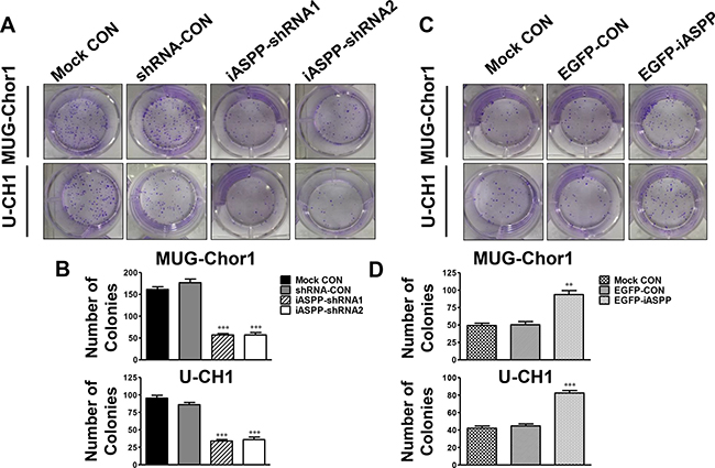 Figure 4: Effect of iASPP knockdown and overexpression on colony formation. (A) Pictures of colony formation assay in MUG-Chor1 and U-CH1 cells after the iASPP knockdown with iASPP-shRNAs. (B) The number of colonies in both cells after the iASPP knockdown with iASPP-shRNAs. (C) Pictures of colony formation assay in MUG-Chor1 and U-CH1 cells after the iASPP overexpression with EGFP-iASPP. (D) The number of colonies in both cells after the iASPP overexpression with EGFP-iASPP. n = 3. Mean ± SEM. **p < 0.01, ***p < 0.001, iASPP-shRNA1 group or iASPP-shRNA2 group vs. shRNA-CON group, and EGFP-iASPP group vs. EGFP-CON group. CON: control.