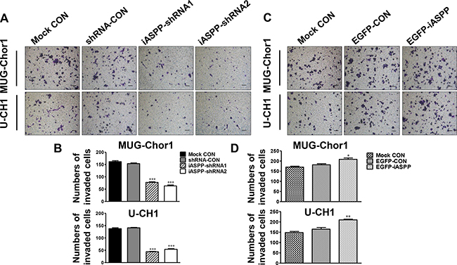 Figure 5: Effect of iASPP knockdown and overexpression on cells invasion. (A) Pictures of transwell invasion assays in MUG-Chor1 and U-CH1 cells after the iASPP knockdown with iASPP-shRNAs. (B) The number of both cells that invaded the substratum of the membrane per view under a 100× magnification after the iASPP knockdown with iASPP-shRNAs. (C) Pictures of transwell invasion assays in MUG-Chor1 and U-CH1 cells after the iASPP overexpression with EGFP-iASPP. (D) The number of both cells that invaded the substratum of the membrane per view under a 100× magnification after the iASPP overexpression with EGFP-iASPP. n = 3. Mean ± SEM. *p < 0.05, **p < 0.01, ***p < 0.001, iASPP-shRNA1 group or iASPP-shRNA2 group vs. shRNA-CON group, and EGFP-iASPP group vs. EGFP-CON group. CON: control. Bar scale = 100 μm.