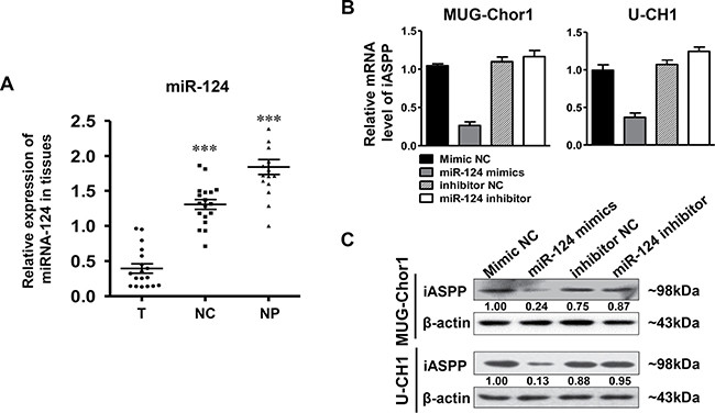 Figure 8: The expression of miRNA-124 in tissues and iASPP expression regulated by miRNA-124. (A) Relative expression of miRNA in tissues as detected by RT-qPCR. ***p < 0.001 vs. tumor group. T: tumor group, NC: normal control tissues group, NP: nucleus pulposus tissues group. (B, C) Relative expression of iASPP in MUG-Chor1 and U-CH1 cells after the transfection of miRNA-124 mimics and inhibitor as detected by RT-qPCR (B) and WB (C). Numbers below picture C represent semi-quantitative analysis of each line by Quantity One software.