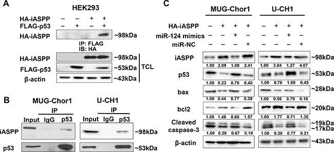 Figure 9: The interaction between iASPP and p53 detected by Co-Immunoprecipitation (Co-IP) assay and the regulation of miRNA-124 on apoptosis function of iASPP. (A, B) The Co-IP detection of the interaction between iASPP and p53 in exogenous (A) and endogenous conditions (B). (C) Changes of apoptosis-related proteins based on the regulation of miRNA-124 on iASPP in MUG-Chor1 and U-CH1 cells. Numbers below picture C represent semi-quantitative analysis of each line by Quantity One software.