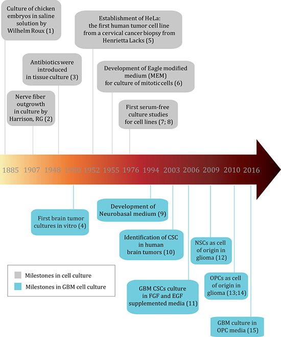 Figure 1: Timeline of important milestones in cell culture and GBM cell culture (reference numbers for milestones can be found in Supplementary File 1).