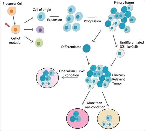 Figure 3: The main players in the evolution of a cancer. The cell that undergoes the first mutation event is considered the cell of mutation, which may or may not undergo transformation to originate a tumor. The cell of origin is the specific cell type that is capable of undergoing transformation that generates the tumor mass. The tumor mass is very heterogeneous, with more differentiated (darker blue colors) and less differentiated cell (lighter blue colors), and it is not clear which cells are responsible for establishing metastasis or new tumors in animal models. To maintain the heterogeneity of clinically relevant tumors, either an “all-inclusive” condition or more than one condition must be used separately.