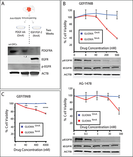 Figure 4: Culture conditions can interfere with response to drugs. (A) Mouse glioma was dissociated, purified through immunopanning and cultured in OPC media (containing PDGF as growth factor) and NSC media (containing EGF/FGF-2 as growth factors). Wild type (wt) OPCs were purified through immunopanning and used as control. PDGFR expression, naturally present in wt OPCs, is reduced when cells are cultured in NSC media, and EGFR starts to be expressed in an active (phosphorylated) form. (B) EGFR inhibitors Gefitinib and AG-1478 reduce cell viability of treated cells only when they are cultured in NSC media (NmA– NSC media accustomed cells), and not in OPC media accustomed cells (OmA). pEGFR = phosphorylated EGFR, tEGFR = total EGFR. Values were normalized based on a non-treated control (vehicle–DMSO-only). (C) A similar response is seen in a human GBM primary cell line accustomed to both NSC media and OPC media and treated with Gefitinib. Samples were normalized based on non-treated controls. **p ≤ 0.01; ****p ≤ 0.0001.