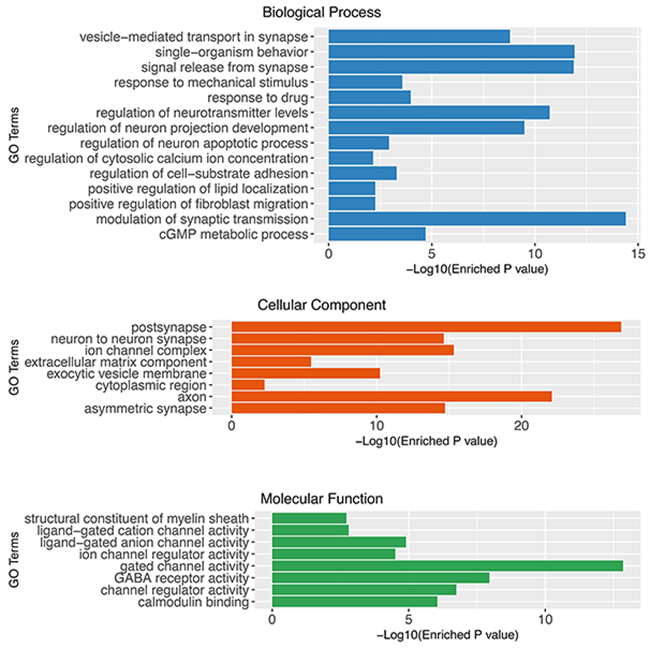 Figure 2: Gene set enrichment analysis of glioblastoma associated genes using Gene Ontology (Cellular Component, Biological Process and Molecular Function).