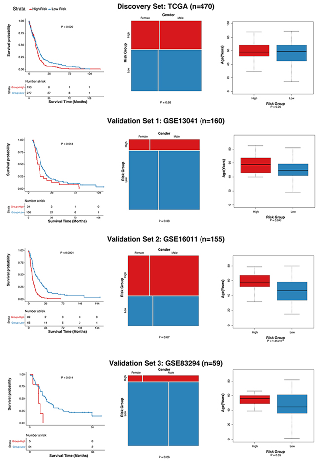 To assess the robustness of the GLO10 score, we then evaluated its performance in other three independent glioblastoma cohorts with GEO accessions GSE13041 (validation set 1, n=160), GSE16011 (validation set 2, n=155) and GSE83294 (validation set 3, n=59). Patients with GLO10 scores higher than 3.58 were assigned into the high risk group, while those with GLO10 scores lower than the threshold were considered as low risk. As shown in Figure 4, there are significant differences between high-risk and low-risk groups (validation set 1: P = 0.044, validation set 2: P < 0.0001, validation set 3: P=0.014). Surprisingly, although high-risk patients tended to have higher age, the gender ratio showed insignificant different patterns (Figure 4, Table 1). This indicated that the GLO10 score retained prognostic power independent of other traditional factors, such as age and gender. The dominance of GLO10 score in the prognosis prediction revealed the importance of the 10 genes (Table 2) in glioblastoma diagnosis and treatment researches.
