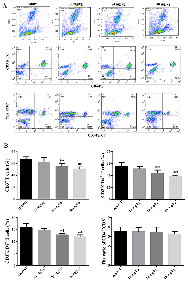 At 21 days of experiment, the CD3+ T cells, CD3+CD4+ T cells and CD3+CD8+ T cells percentages were significantly reduced (P<0.01) in the 24 mg/kg and 48 mg/kg groups when compared with those in the control group. The ratio of CD4+/CD8+ T cells was no significant change between the control group and NaF-treated groups. The results were shown in Figure 1B.