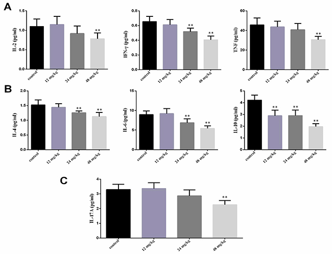 The results showed that the IL-2, IFN-γ and TNF contents were significantly lower (P<0.01) in the 48 mg/kg group at 21 days of experiment and IFN-γ contents were significantly lower (P<0.01) in the 24 mg/kg group at 21 days of experiment than those in the control group. The IL-4, IL-6 and IL-10 contents were significantly decreased (P<0.01) in the 24 mg/kg and 48 mg/kg groups at 21 days of experiment and IL-10 contents were significantly reduced (P<0.01) in the 12 mg/kg group at 21 days of experiment. The IL-17A contents were significantly reduced (P<0.01) in the 48 mg/kg group at 21 days of experiment when compared with those in the control group, as shown in Figure 3.