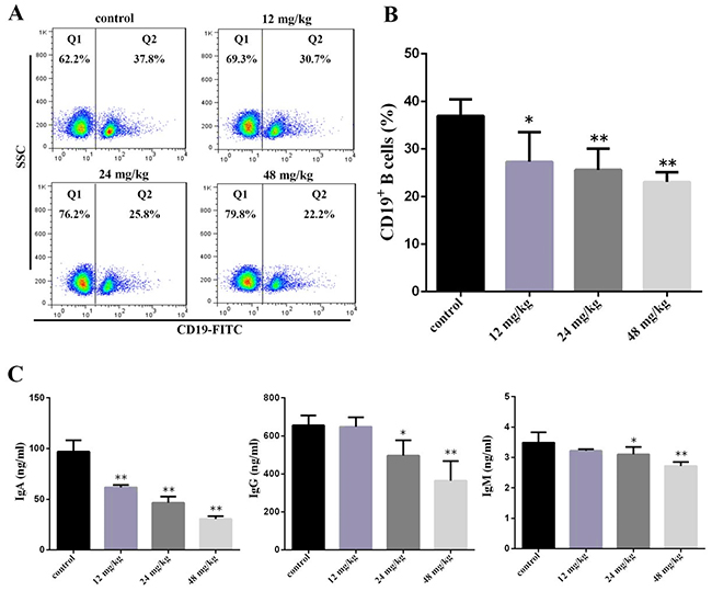 At 21 days of experiment, the results in Figure 5B showed that the percentages of CD19+ B cells were significantly decreased (P<0.05 and P<0.01) in the three NaF-treated groups when compared with those in the control group. Figure 5C showed that the IgA contents were significantly lower (P<0.05 and P<0.01) in the three NaF-treated groups than those in the control group. The IgM and IgG contents were significantly reduced (P<0.05 and P<0.01) in the 24 mg/kg and 48 mg/kg groups when compared with those in the control group.