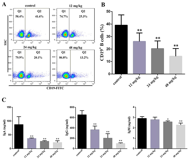 At 21 and 42 days, the peripheral blood of eight mice in each group was taken to determine the percentages of CD 19+ B lymphocyte by flow cytometry.